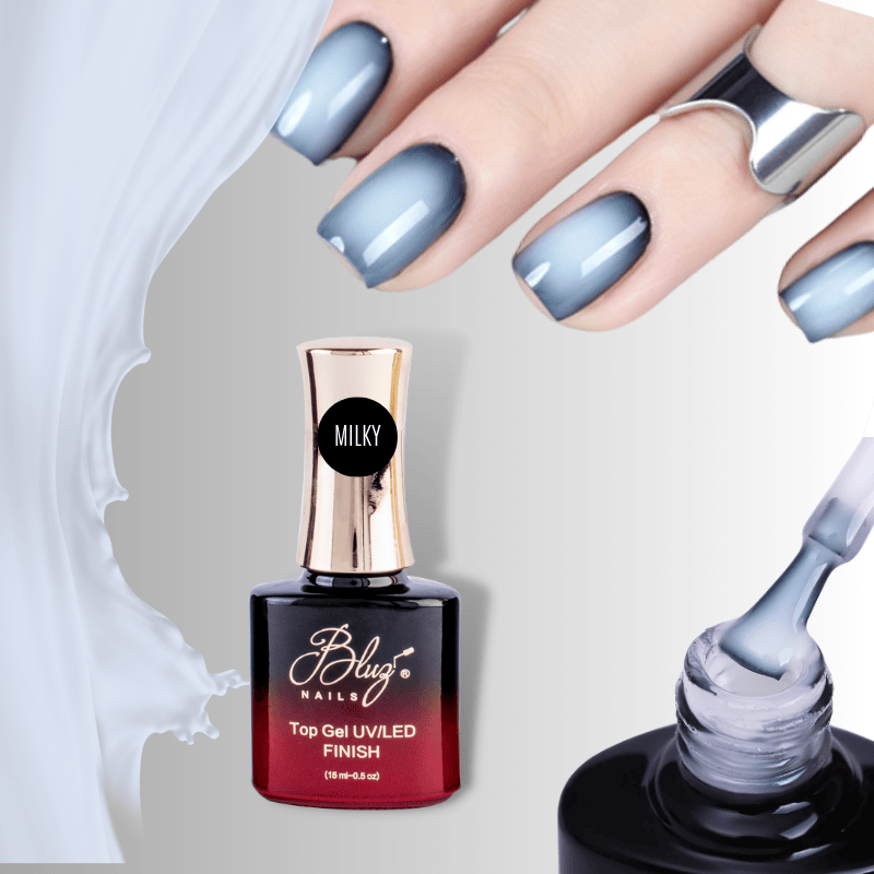 Top coat 4 en 1 con acabado blanco lechoso brillante. Sella, refuerza, nivela y permite construir según el grosor de aplicación. Autonivelante, resistente al desgaste y al amarillamiento, ideal para efectos degradados, french suaves y diseños modernos.